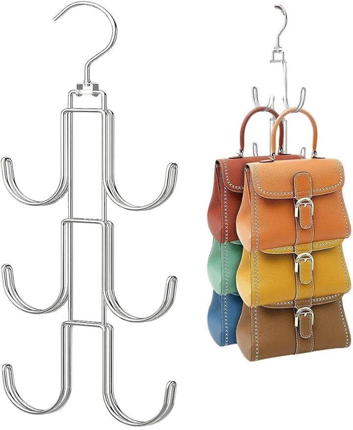 「360度回転可能」バッグを垂直に吊るすことで形くずれを防ぎ、クローゼットのハンガーパイプやラックに直接取り付けられる設計がなされています。