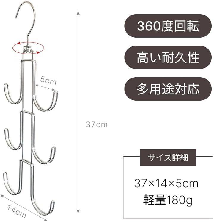 「省スペース空間を活かす」回転式フックで省スペース収納ができるバッグハンガーは、縦方向の空間を活かし、帽子からネクタイまで6つのアイテムを手軽に収納できます。