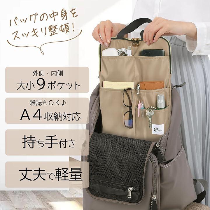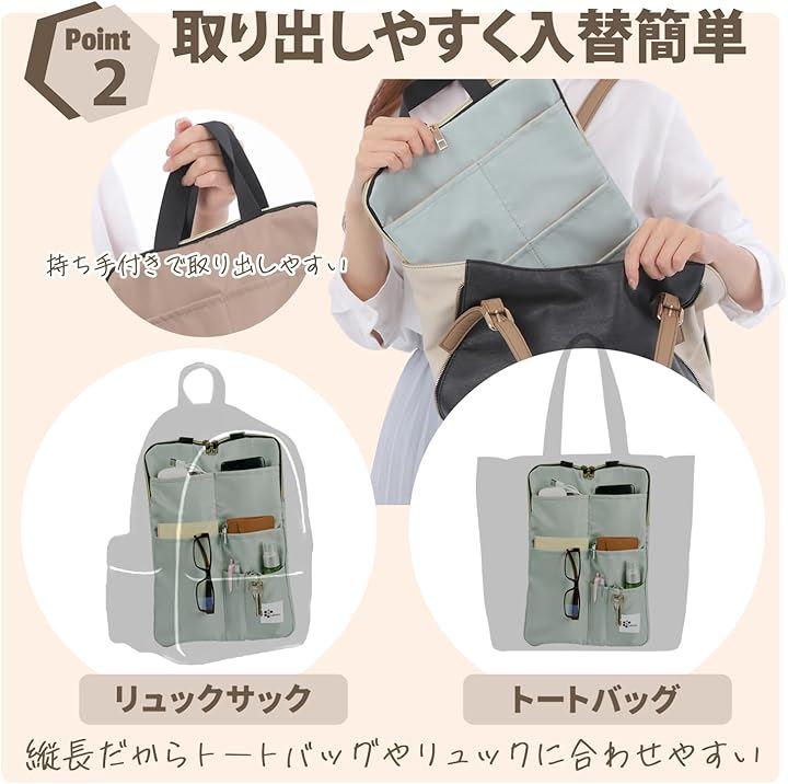 「バッグ間の移動も簡単」バッグをかえたりする際必要な物を入れ忘れたりして困ったことはありませんか?持ち手のついたバッグインバッグなので入れたままバッグ内の移動ができて便利です。