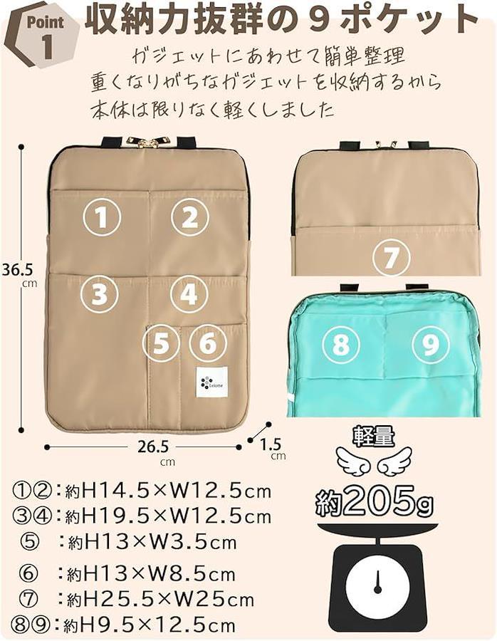 「負担にならない軽量バックインバック」重さ約204グラムなのでバッグ内に収納しても重さを感じず、今まで通り荷物を収納しながらもバッグ内の収納・整理を効率的に行えます。