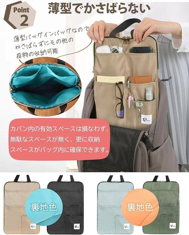 「薄型でかさばらないバッグインバッグ」バッグの容量を損なわずに収納できる薄型で縦型のバッグインバッグです。