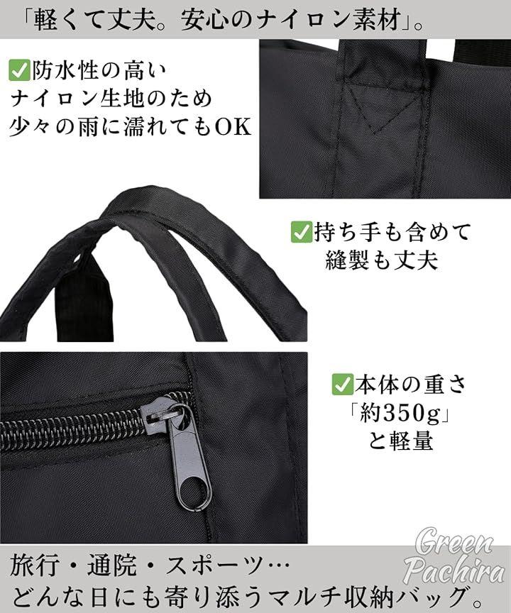 ナイロン素材で安心」バッグ本体は、重さ約350gと軽量ながら、耐久性と防水性の高い「ナイロン素材」を使用。