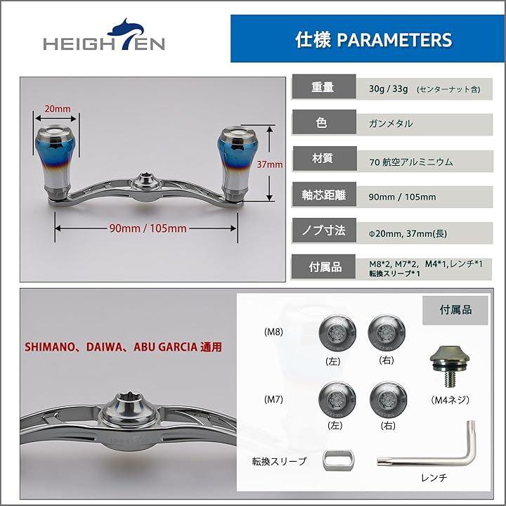 「サイズ」ノブ直径20mm、ハンドル軸心距離90mm/105mm/115mm 「総重」30g/33g/36.5「素材」70シリーズ航空アルミ。