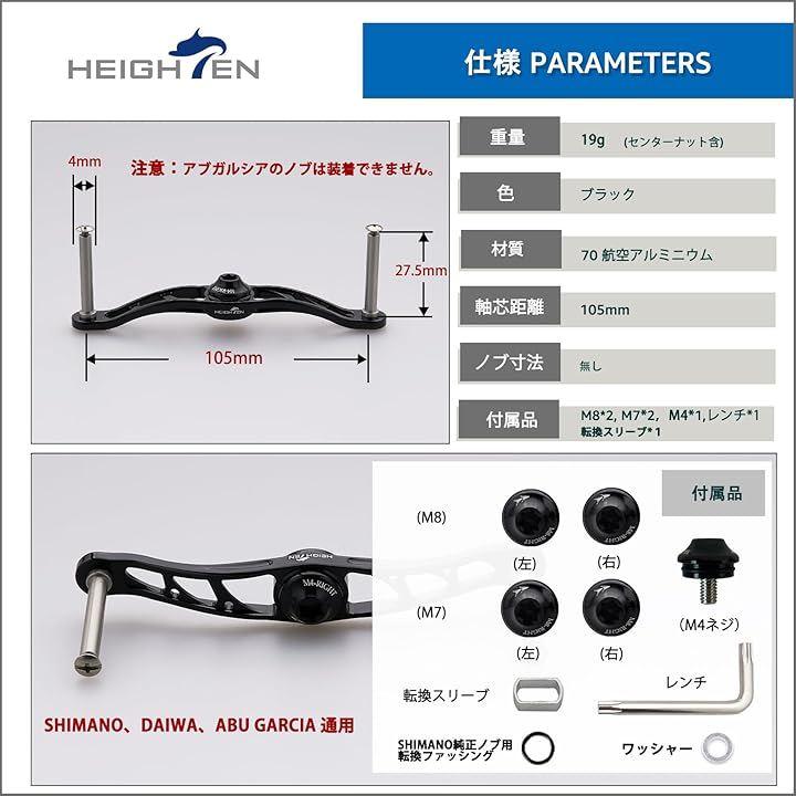 「サイズ」ハンドル軸心距離88mm/90mm/105mm/115mm/120mm/130mm 「総重」19g /14.5g / 19g / 21g /23g/ 26g(ハンドル+6角ワッシャー1個+ノブ固定用ネジ2個 、ハンドル固定ボルト)「素材」70シリーズ航空アルミ。