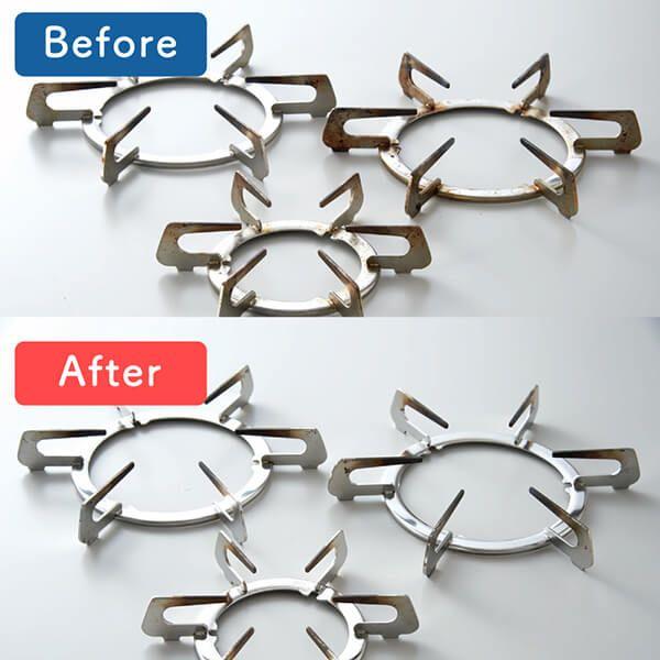 重曹はやわらかい結晶なのでやさしく研磨して汚れを落とします。また少し水に湿らせてペースト状にすると結晶の角がとれて、傷つけずに汚れを取り除くことができます。