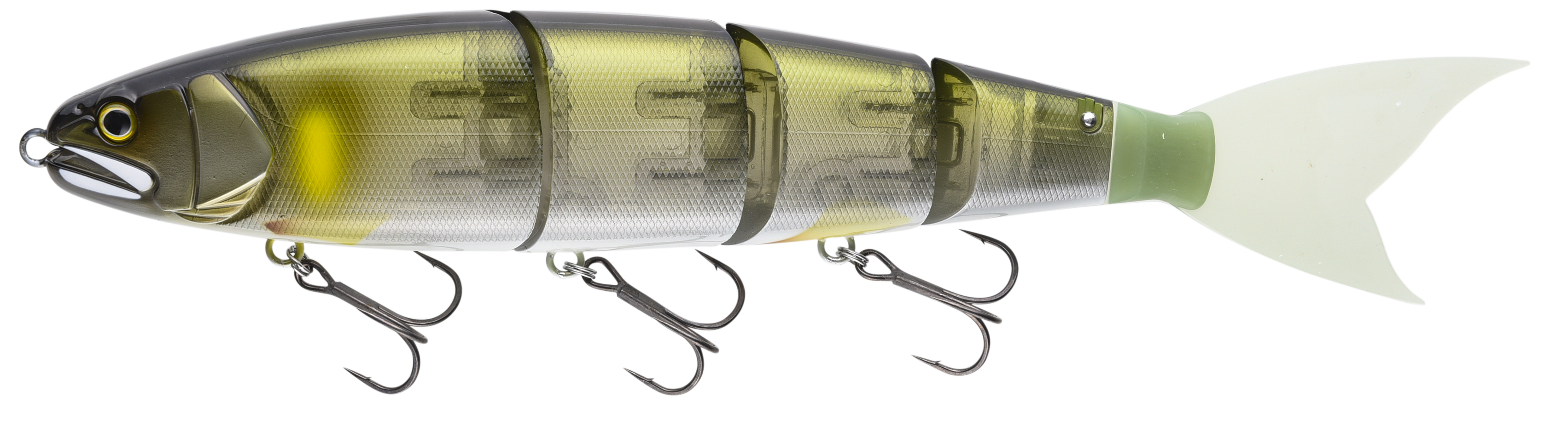 ファストリトリーブ時の凄まじい動きの“ライブ感”デッドスティッキング時の“静の中の動”そしてエイトトラップ®という狂気的な“魔力を持った釣法”この3つの魔力を持ったジャイアントベイト今までのジャイアントベイトに無かった超高速リトリーブを多連結ボディで可能にし、高速巻きでも安定したスイム姿勢をキープすることで逃げ惑うベイトを極限まで演出。ストラクチャーに潜む早い動きにしか反応しないデカバスを仕留めます。デッドスティッキング時には多連結ボディとシリコンテールが生物的で艶めかしい動きを演出し、スレたデカバスを誘いだしショートバイトも逃さない3フックシステム搭載でデカバスを仕留めます。そして特に強い魔力を持ったエイトトラップ釣法。(8の字釣法)足元まで追いかけて来たデカバスを完全に狂わせ、今迄完全に諦めてきた全てのフィッシュイーターにもう一度スイッチを入させることができる釣力はまさに魔力。これから始まる『ジャイアントベイトの新境地』覚醒した貴方に逃げ道は無くなる!!!