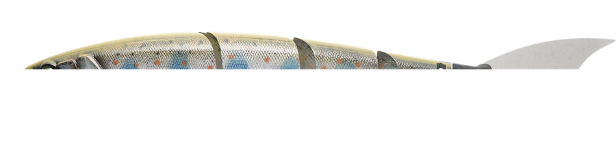 ファストリトリーブ時の凄まじい動きの“ライブ感”デッドスティッキング時の“静の中の動”そしてエイトトラップ®という狂気的な“魔力を持った釣法”この3つの魔力を持ったジャイアントベイト今までのジャイアントベイトに無かった超高速リトリーブを多連結ボディで可能にし、高速巻きでも安定したスイム姿勢をキープすることで逃げ惑うベイトを極限まで演出。ストラクチャーに潜む早い動きにしか反応しないデカバスを仕留めます。デッドスティッキング時には多連結ボディとシリコンテールが生物的で艶めかしい動きを演出し、スレたデカバスを誘いだしショートバイトも逃さない3フックシステム搭載でデカバスを仕留めます。そして特に強い魔力を持ったエイトトラップ釣法。(8の字釣法)足元まで追いかけて来たデカバスを完全に狂わせ、今迄完全に諦めてきた全てのフィッシュイーターにもう一度スイッチを入させることができる釣力はまさに魔力。これから始まる『ジャイアントベイトの新境地』覚醒した貴方に逃げ道は無くなる!!!