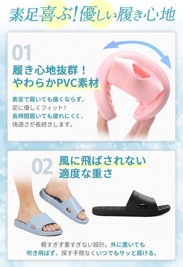 雨上がりのベランダや濡れた床でもすぐ履ける水はけ速乾設計で、足裏はいつでもサラッと快適。