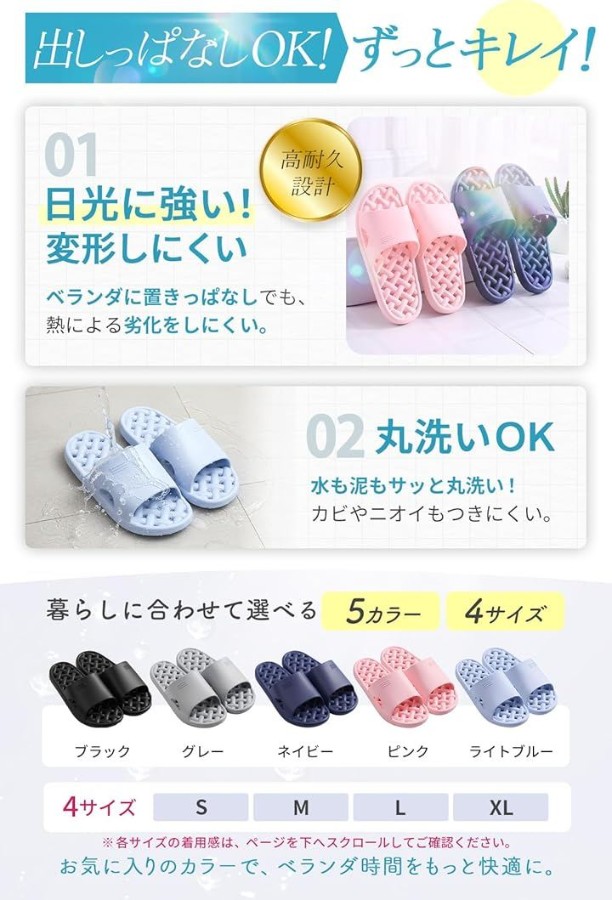 ベランダ サンダルとして外に置いておいても乾きやすく、気持ちよく使えます。