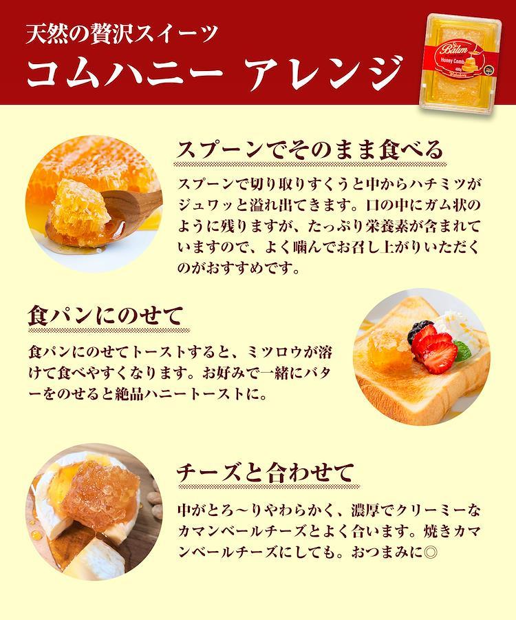 【コムハニーとは?】巣蜜とも呼ばれ、ミツバチの貯蔵庫をそのままカットした巣ごと味わう自然のままの生はちみつです。巣にはローヤルゼリーやプロポリスをはじめ、ビタミンやミネラルなどの栄養素もが、そのままギッシリと詰まっています。
