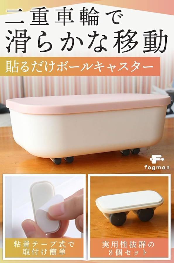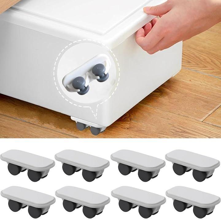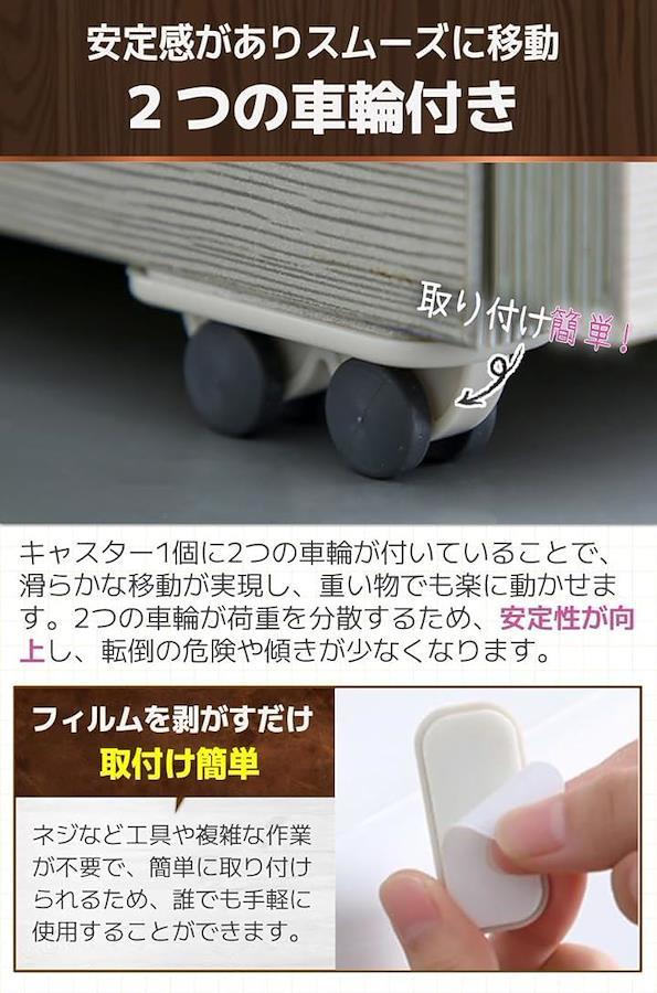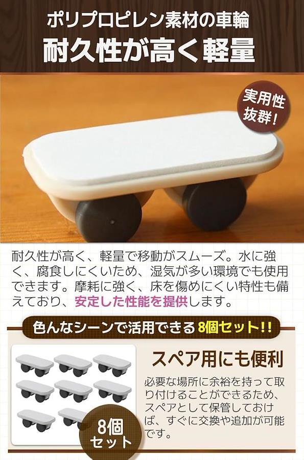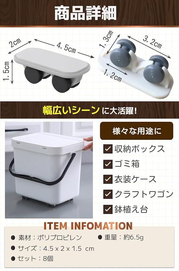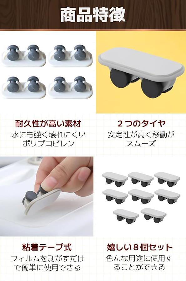 「商品特徴」(1)耐久性が高い素材:水にも強く壊れにくいポリプロピレン/(2)2つのタイヤ:安定性が高く移動がスムーズ/(3)粘着テープ式:フィルムを剥がすだけで簡単に使用できる/(4)嬉しい8個セット:色んな用途に使用することができる