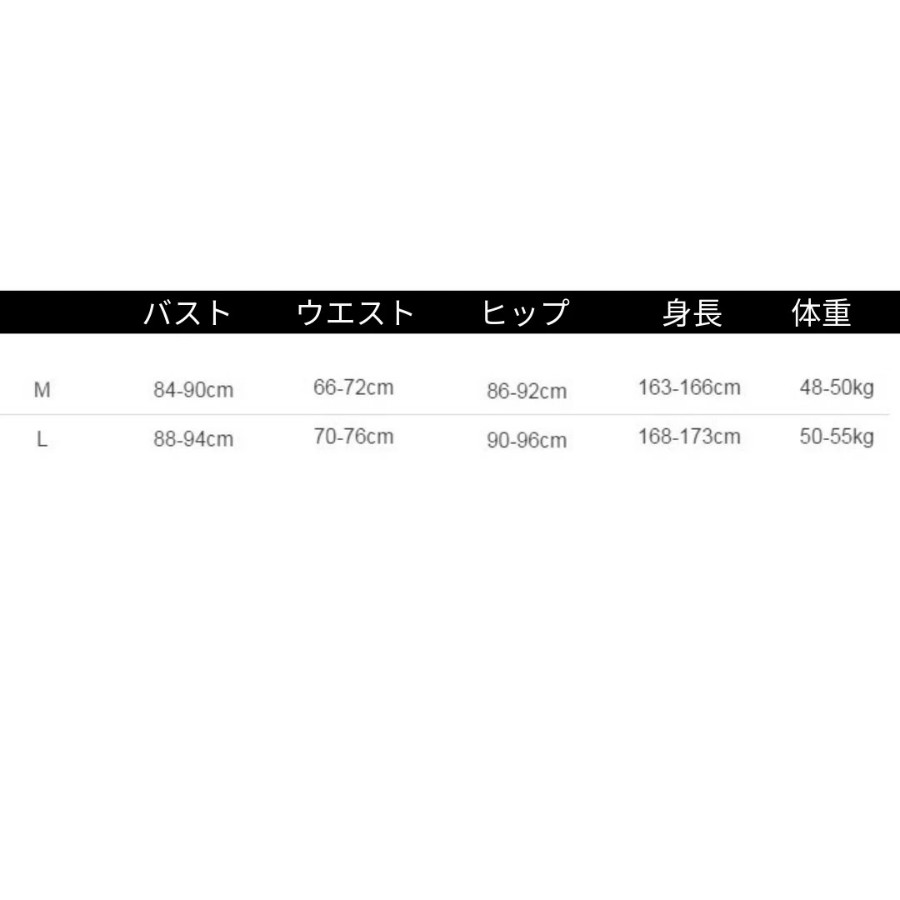L:バスト88-94cm/ウエスト70-76cm/ヒップ90-96cm/身長168-173cm/体重50-55kg