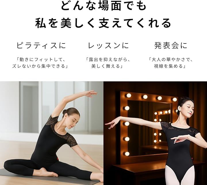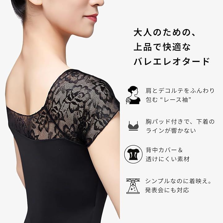 「大人の美しさをまとう、エレガントな一着」 繊細なレースで肩を包み込み、デコルテを美しく演出するレオタード。