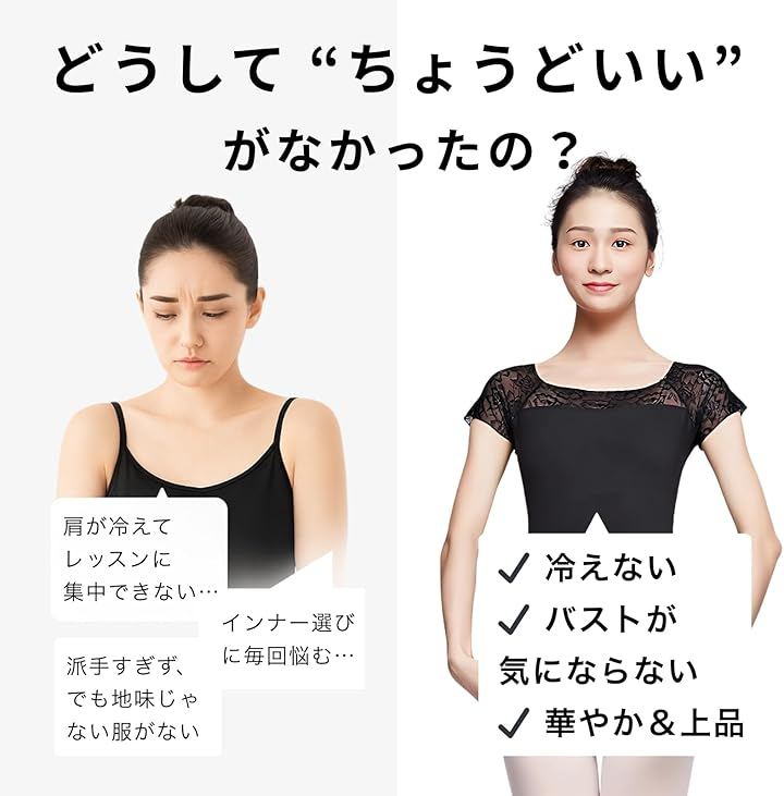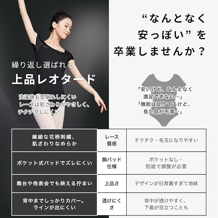 「レッスンに集中できる、体に寄り添う着心地」 胸パッド付きでカップ入れ不要。
