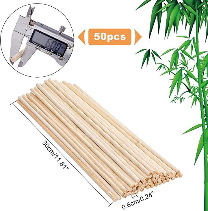 ・「サイズ詳細」竹製スティック:長さ約300mm、直径約6mm;50本があります。