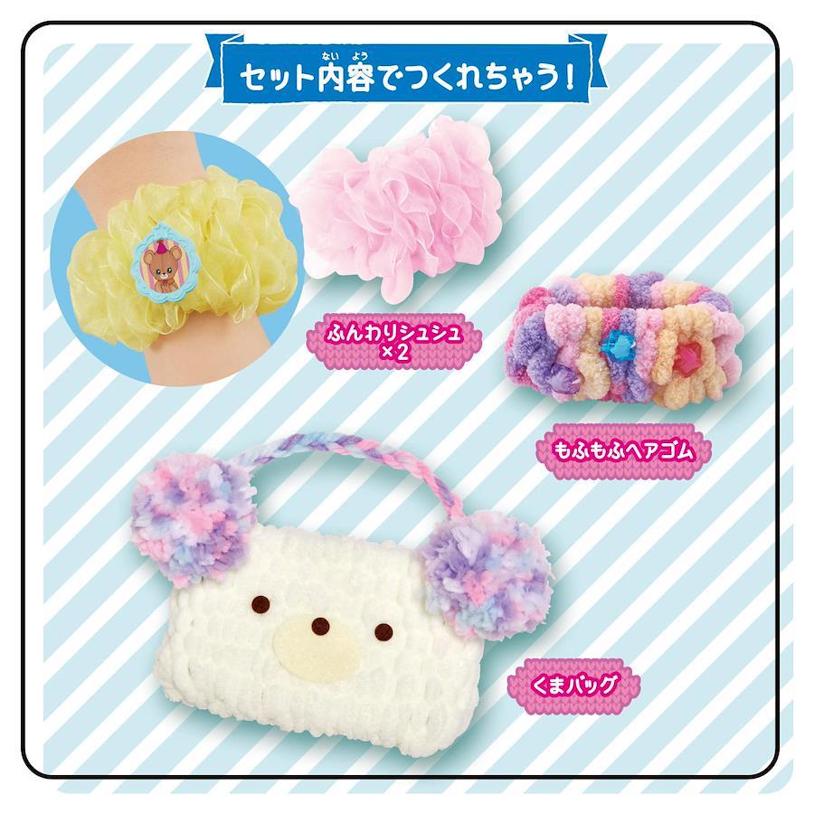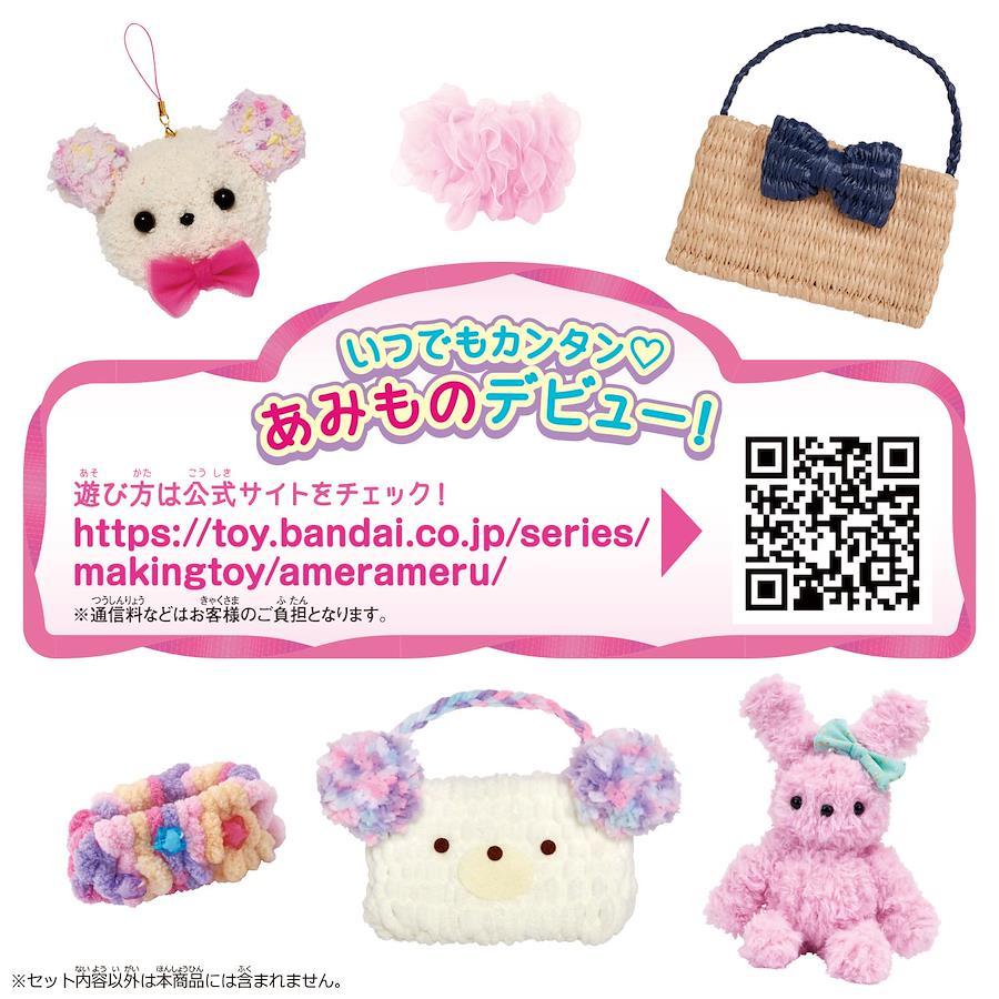 いろいろな素材で簡単にあみものが楽しめるメイキングトイ「アメールアメール」が登場!毛糸はもちろん、毛糸以外の素材を使ってあみものが楽しめます。セット内容のオーガンジーリボンを使って、本体にヘアゴムをセットしリボンをヘアゴムに編んでいけばふんわりシュシュの完成!セット内容だけでシュシュ・ヘアゴム・くまバッグが作れます。市販の素材を使えば、更にオールシーズンいろいろなあみものを作って遊べます。(本商品に付属するもの以外すべて別売りです。)対象年齢:5才~電池1:電池・不要(C)BANDAI