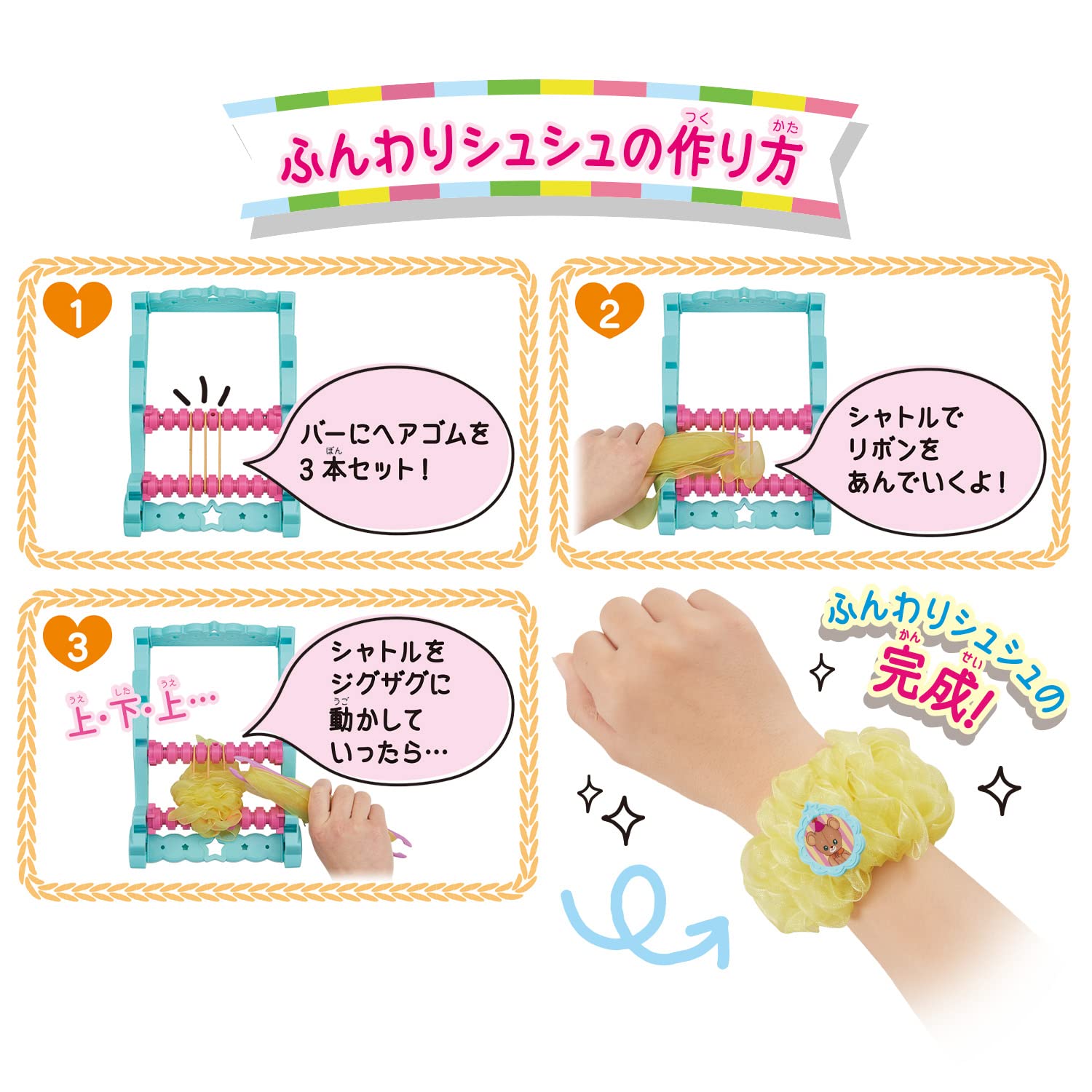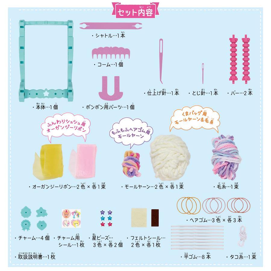 3営業日以内に発送≪新品未開封品≫:[セット内容]・本体・・・1個・バー・・・2本・シャトル・・・1本・コーム・・・1個・ボンボン用パーツ・・・1個・仕上げ針/とじ針・・・各1本・オーガンジーリボン・・・2色×各1束・モールヤーン・・・2色×各1束・毛糸・・・1束・チャーム・・・4個・チャーム用シール・・・1枚・星ビーズ・・・3色×各2個・フェルトシール・・・2色×各1枚・平ゴム・・・8本・ヘアゴム・・・3色×各3本・タコ糸・・・1束・取扱書・・・1枚