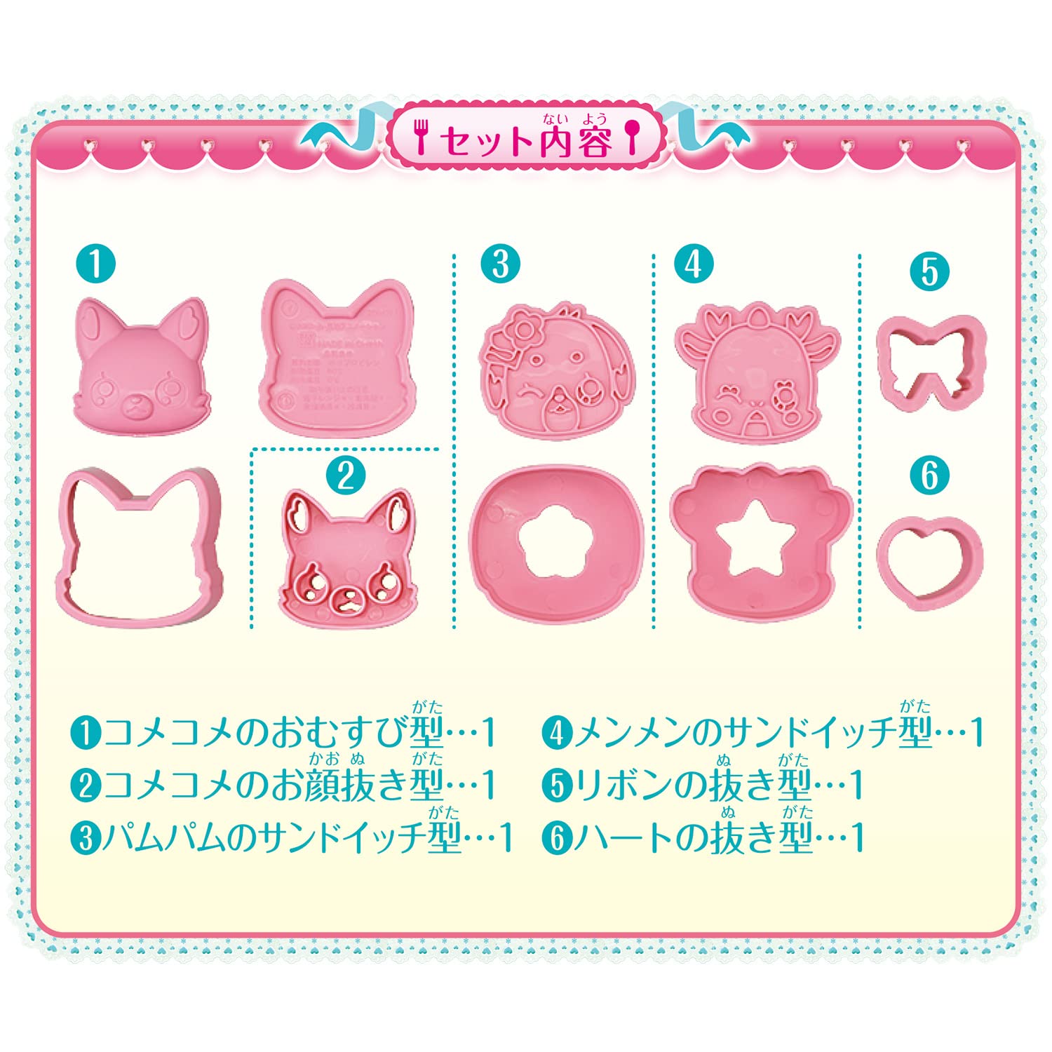 コメコメの形をしたおにぎりや、パムパム&メンメンのサンドイッチが作れるクッキング型のセットです。