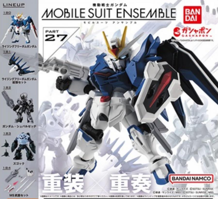 全5種コンプリートセット(全5種×各1個ずつ)武装によるシルエット変化をテーマとした「MOBILE SUIT ENSEMBLE」シリーズの第27弾 内容 1. ライジングフリーダムガンダム 2. ライジングフリーダムガンダム拡張セット 3. ガンダム・シュバルゼッテ 4. ズゴック 5. MS武器セット