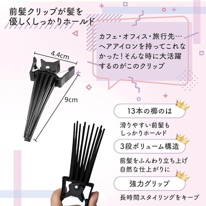 13本の櫛状ピンと3段ボリューム構造で、前髪をしっかりホールド。