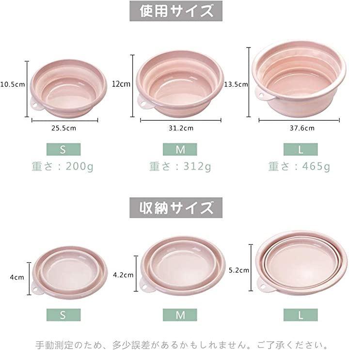 折りたたみサイズ:S(口径:25.5cm・高さ:4cm) M(口径:31.2cm・高さ:4.5cm)L(口径:37.6cm・高さ:5.2cm)