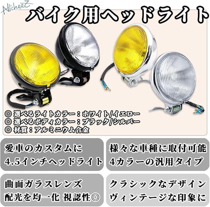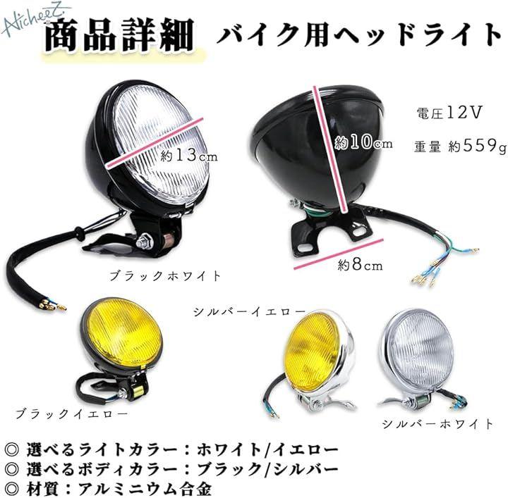 「商品内容」 バイク用ヘッドライト 材質:アルミニウム合金 ボディカラー:シルバー/ブラック レンズカラー:クリア/イエロー サイズ:外径/約13cm 長さ/約10cm 取り付けボルト/約8cm 重量:約559g 電圧:12V