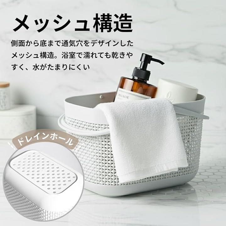 「メッシュ構造」側面から底まで通気穴をデザインしたメッシュ構造で、浴室で濡れても乾きやすく、水がたまりにくい。