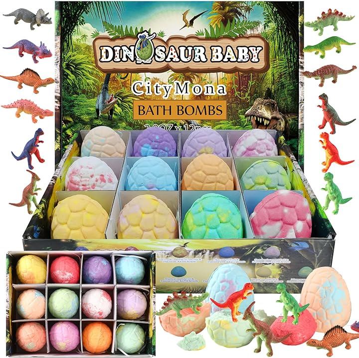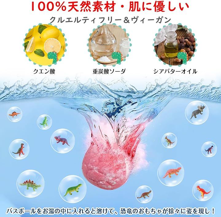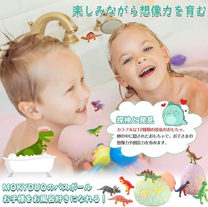 ・不思議な卵型バスボム: 12個のユニークな色の卵型バスボムが含まれ、それぞれ異なる恐竜が中に埋まっています。