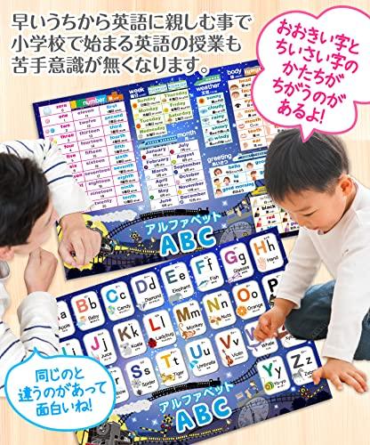 アルファベット表とかんたんな単語表の2枚セット 男の子に人気の電車系(銀河鉄道)星空デザイン 水で貼って剥がせる防水ポスター(ユポ紙使用) B3サイズ (横51.5cm×縦36.4cm) お風呂だけではなくお部屋やトイレにも