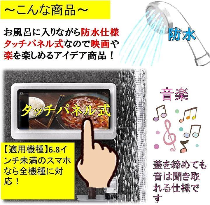 ・お風呂 浴室 用 スマホカバー 防水ケース。タッチパネルで 防水仕様 のスマホスタンド。 壁掛け 貼り付け 式なので落下せず安心して 携帯を眺めることができます