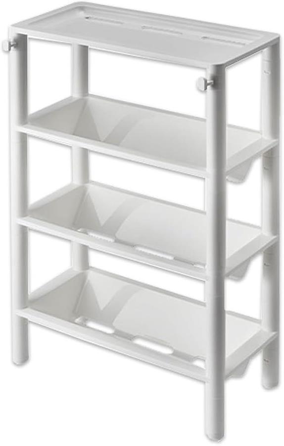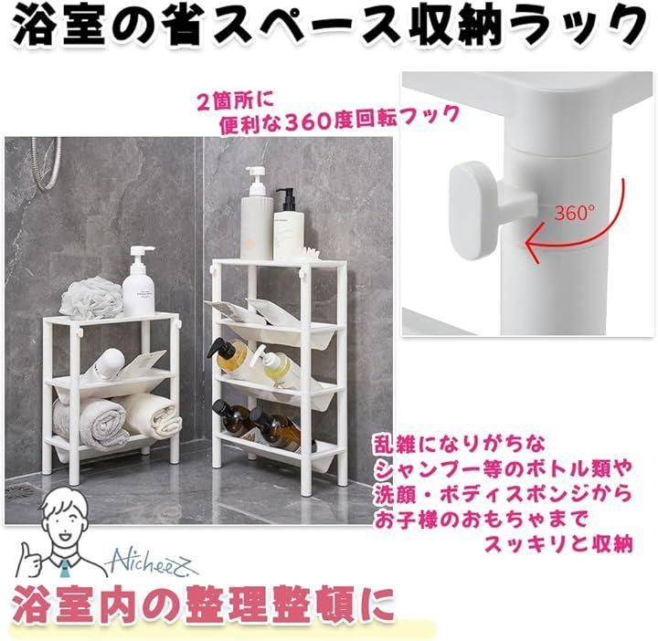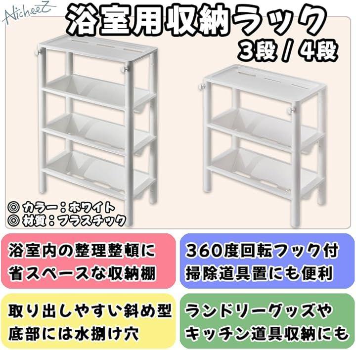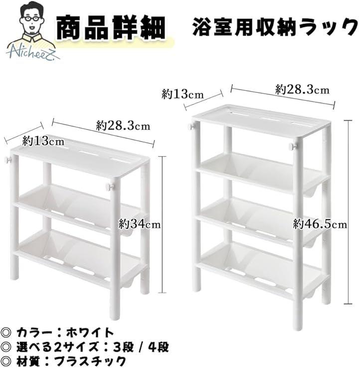 「商品内容」 浴室用収納ラック 材質:プラスチック カラー:ホワイト サイズ:3段高さ/約34cm 4段高さ/約46.5cm 横/約28.3cm 縦/約13cm *簡単な組み立て式となります