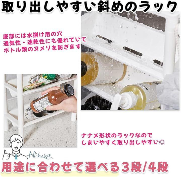 「取り出しやすい斜めラック」ラック底部には水捌け用の排水穴があり、通気性・速乾性にも優れていてボトル類のヌメリを防ぎます。