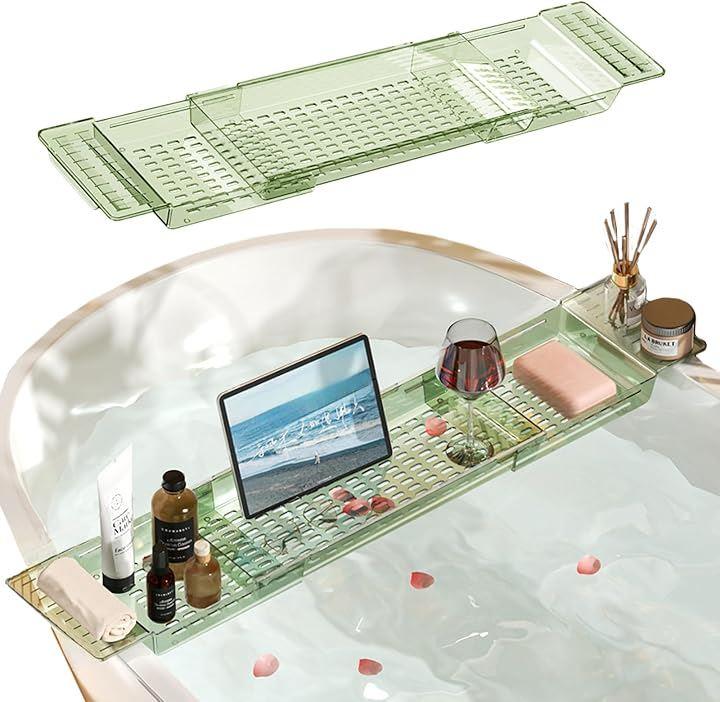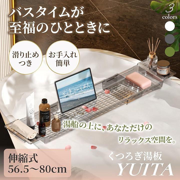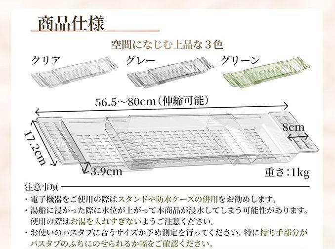 伸縮式で56.5cmから80cmまで調整可能なこの浴槽ラックは、スマートフォンやタブレット、入浴グッズを手元に置けるスペースを提供します。