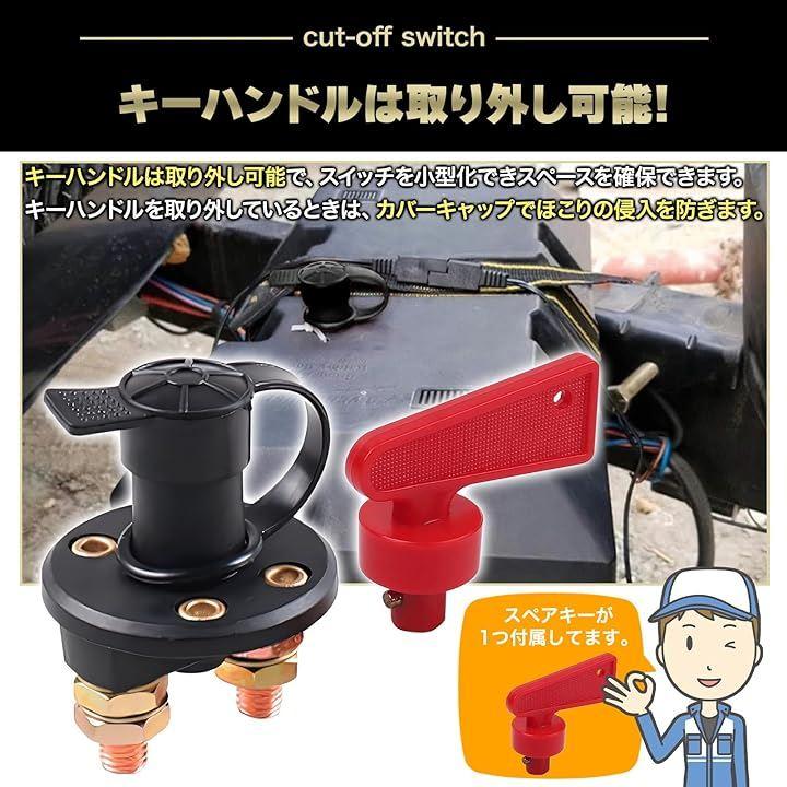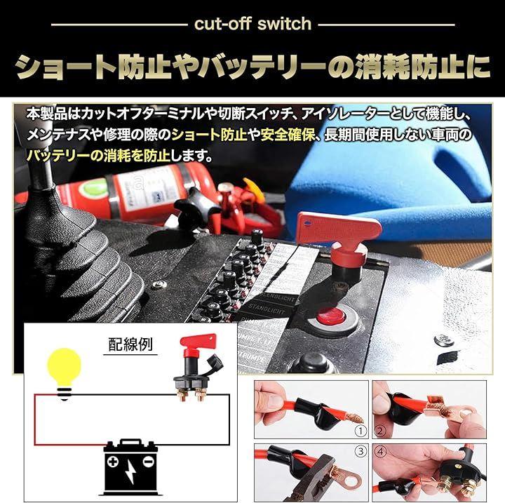 本製品はカットオフターミナルや切断スイッチ、アイソレーターとして機能し、メンテナスや修理の際のショート防止や安全確保、長期間使用しない車両のバッテリーの消耗を防止します。