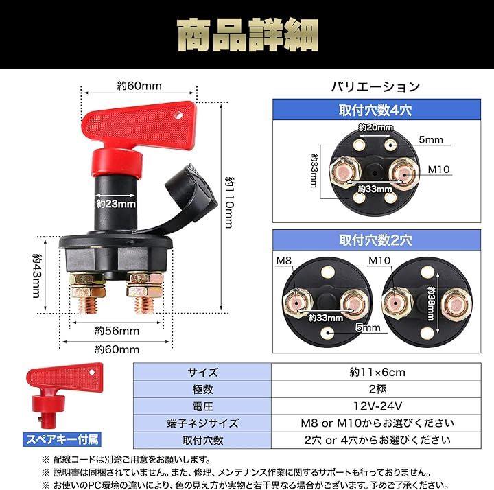 「サイズ」約11x6cm 「極数」2極 「電圧」12V-24V 「端子ネジサイズ」M8 or M10からお選びください 「取付穴数」2穴 or 4穴からお選びください
