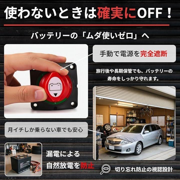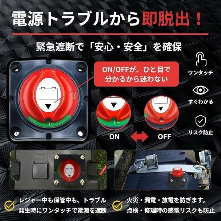 「高い安全性と緊急遮断機能」 本製品はDC12V~48Vの幅広い電圧に対応し、車・船舶・キャンピングカー・太陽光発電など様々な電源管理に活躍するバッテリー切断スイッチです。