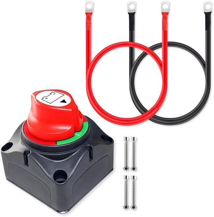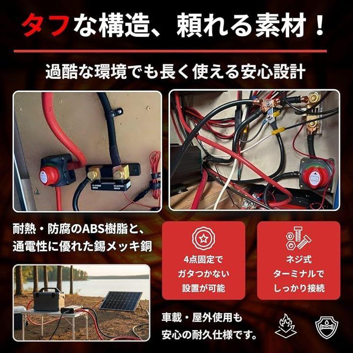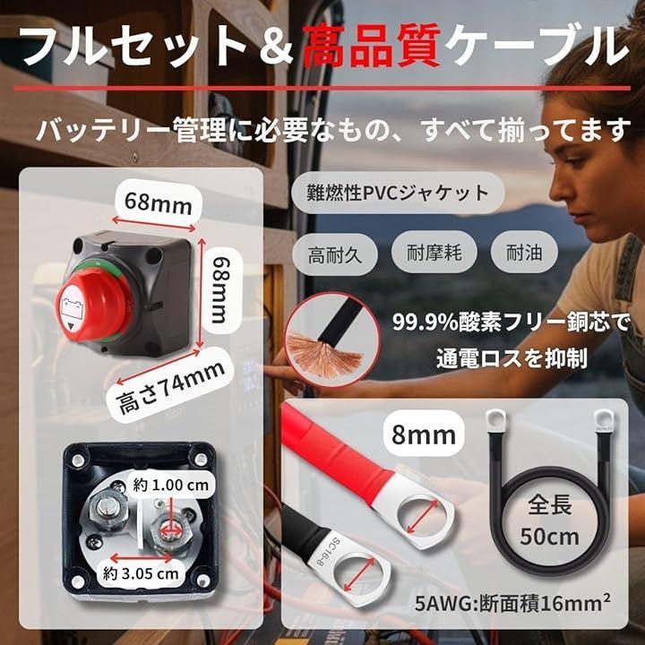 「フルセット構成で届いてすぐに取り付け可能」 本製品はスイッチ本体に加え、太い8mm端子のケーブル(全長50cm/5AWG・断面積16mm2)もセットになっており、バッテリー管理に必要なものがすべて揃ったフルセットです。