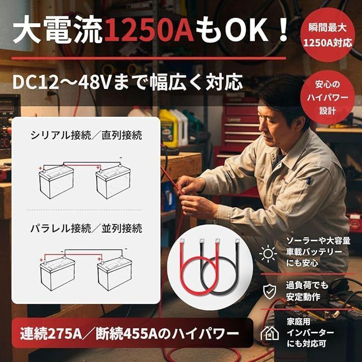 「瞬間最大1250A対応のハイパワー設計」 瞬間最大1250A、連続275A、断続455Aまで対応したハイパワー仕様で、大容量バッテリーや家庭用インバーターとの組み合わせでも安定動作を実現します。