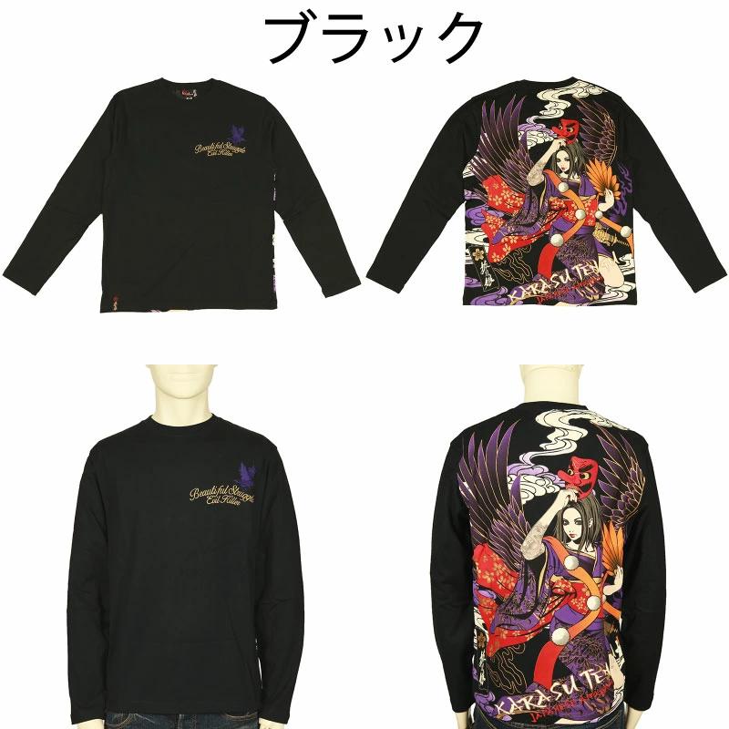 【デザイン】抜刀娘から新作和柄アイテムの登場です。凛×烏天狗 柄 和柄 長袖 Tシャツ です。今回の抜刀娘は、人気の妖怪シリーズです。烏天狗になった抜刀娘の凛を背面に落とし込ました。背景には雲やロゴを組み合わせ配置。フロントはシンプル左胸に英ロゴに八咫烏を刺繍とプリントで配置。抜刀娘らしい一枚に仕上がりました。