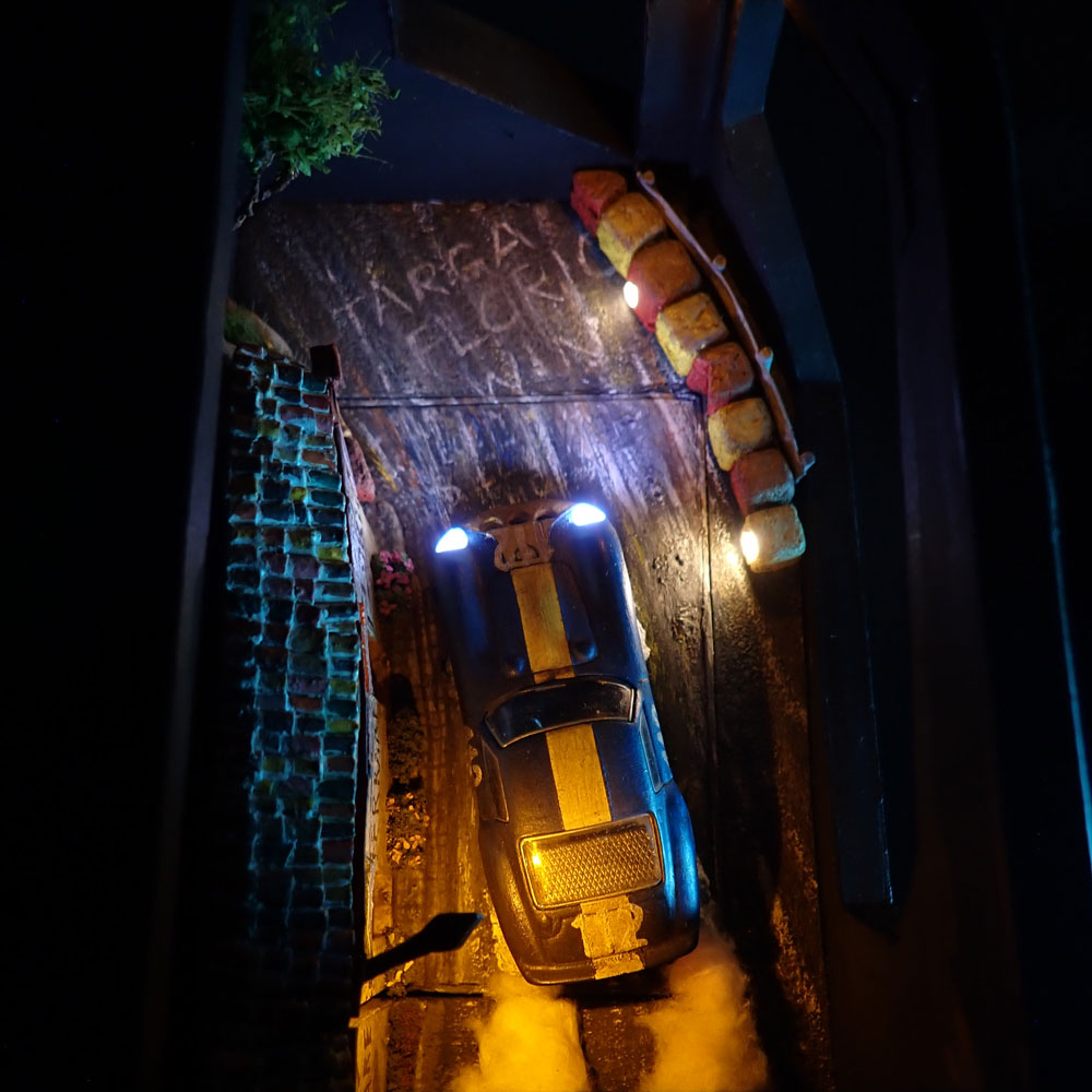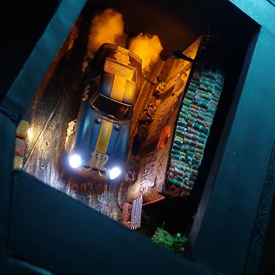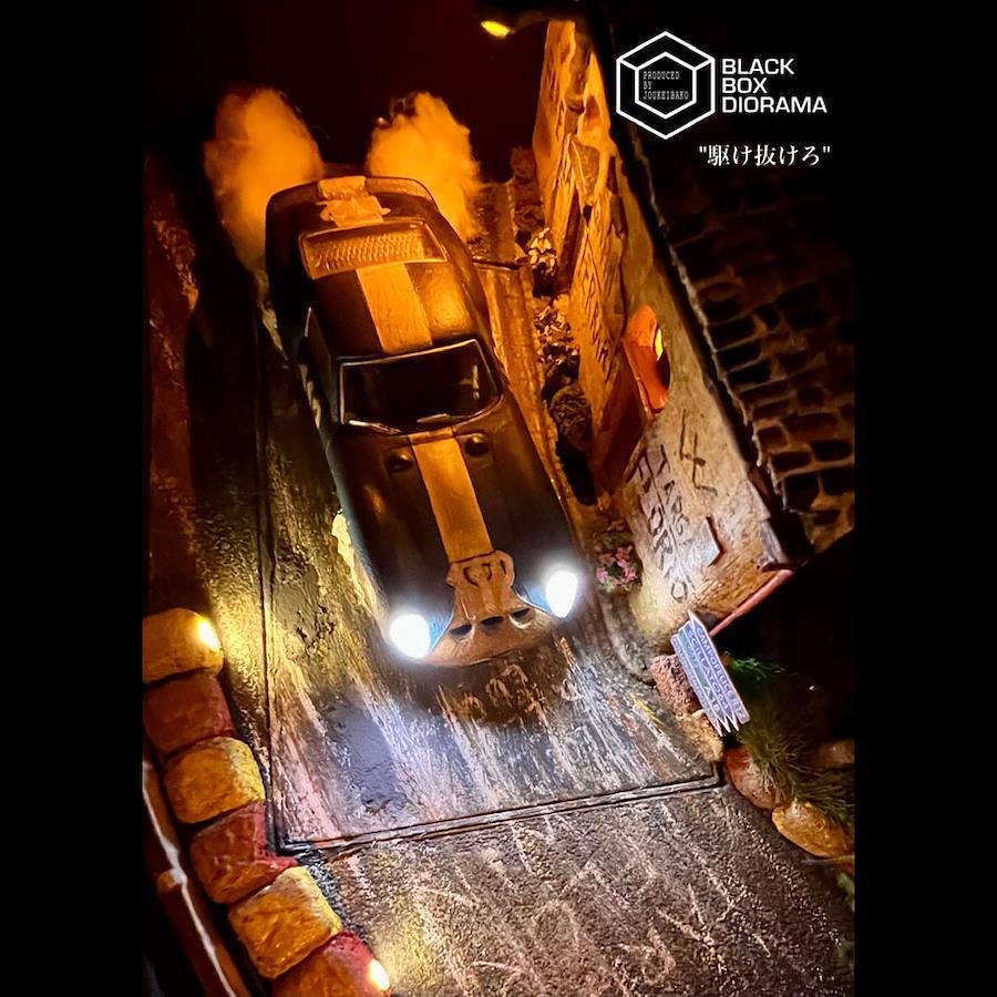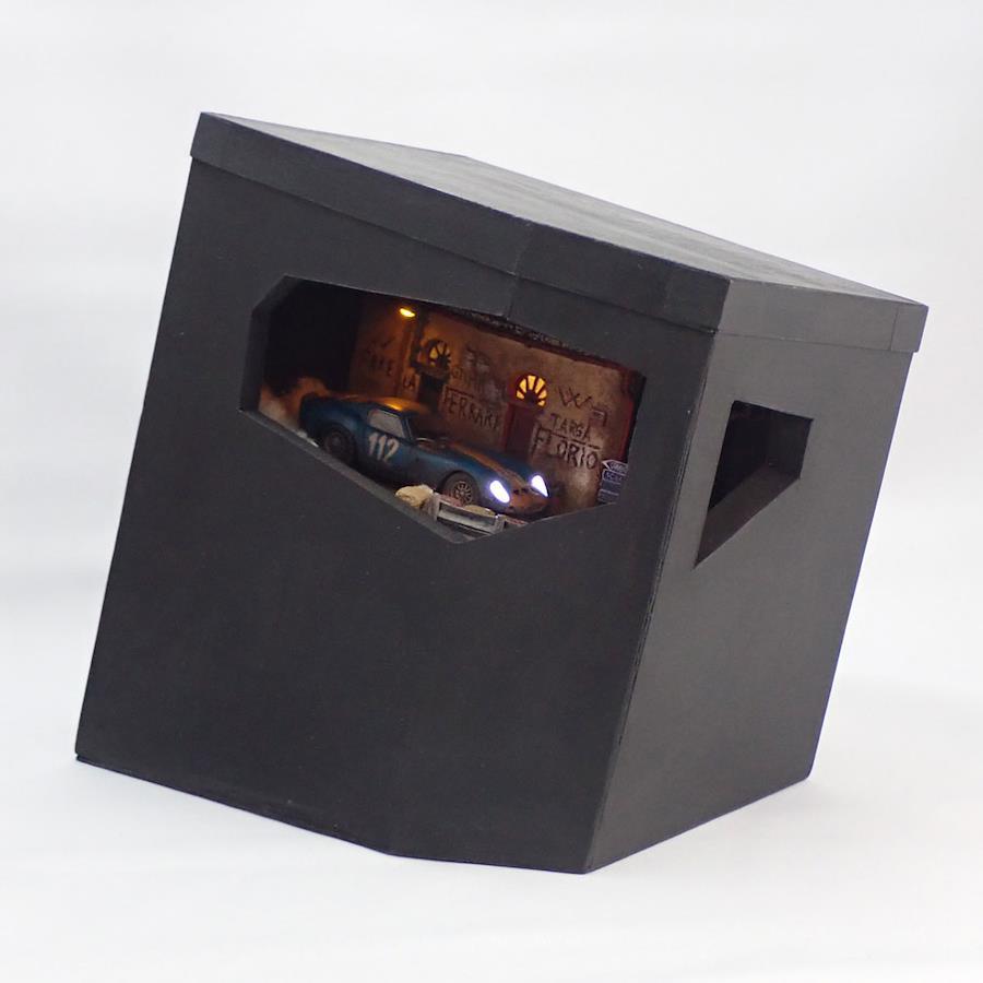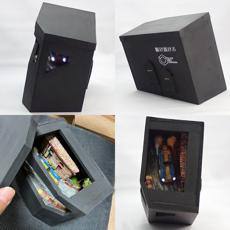 BBD(ブラック・ボックス・ジオラマ)とは極小のジオラマ作品シリーズ「情景箱」を発展させた川田氏の新しいシリーズです。黒い箱の中に作品を入れて、箱の開口部から覗き込むような鑑賞スタイルにしてあります。光を遮断、作品を見る方向も限定することで、暗い空間に場面が浮かび上がるような演出となって、一層、作品世界に没中できます。