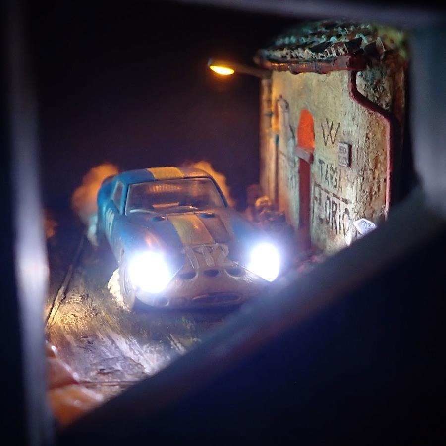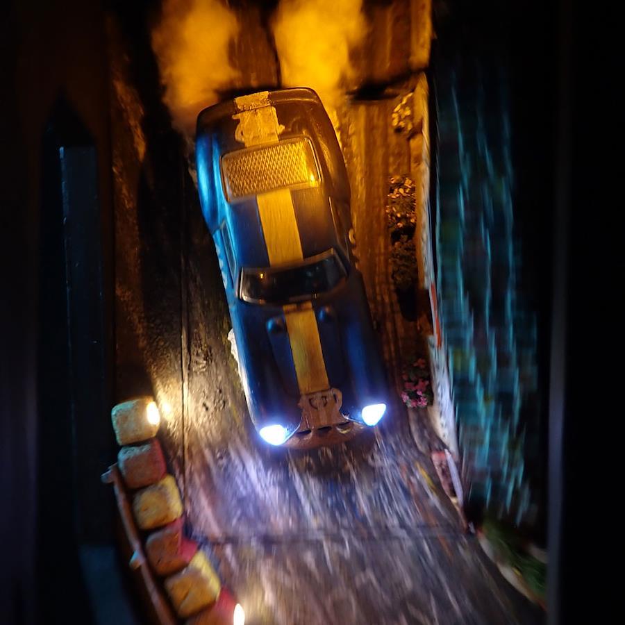 The white smoke curling up from the tires in the scene where the car runs through a corner at high speed emphasizes the sense of speed.