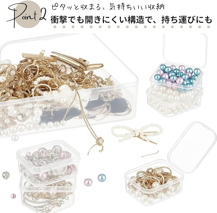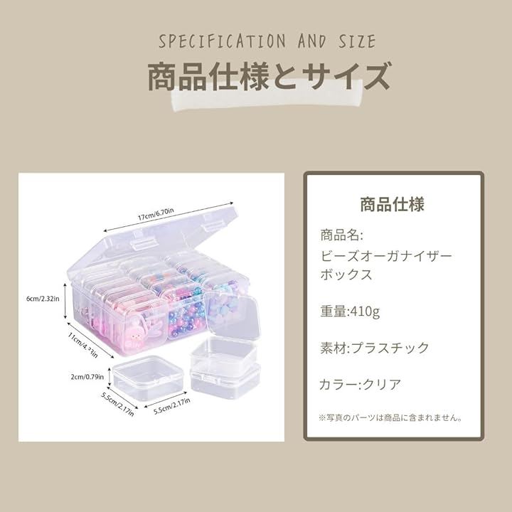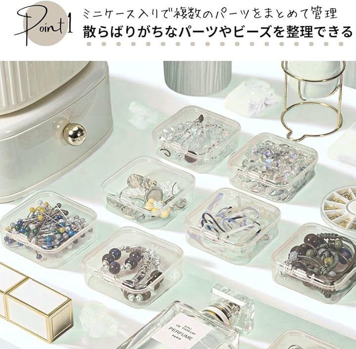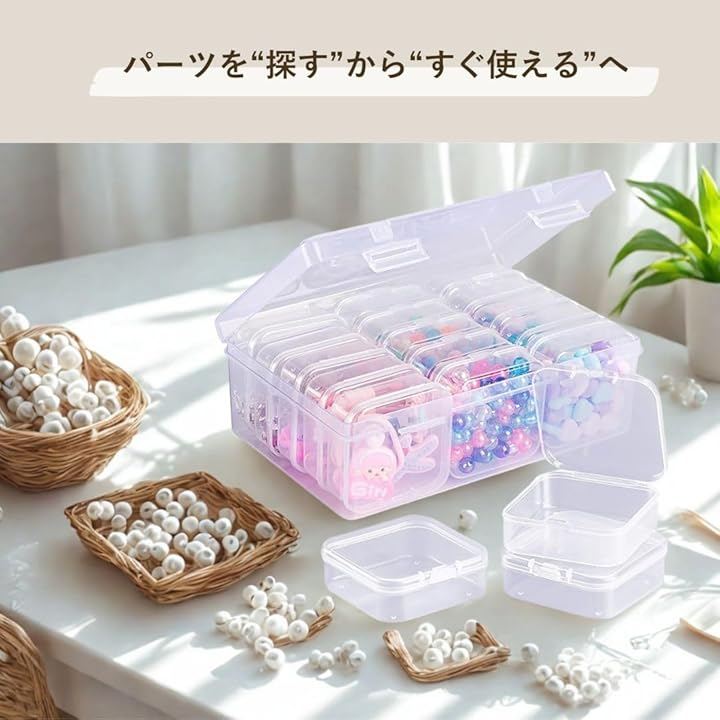 ケースが透明で何が入っているかすぐわかる。散らばりがちなビーズ、ネイルパーツ、ボタン等を整理すると、探す時間も短縮。