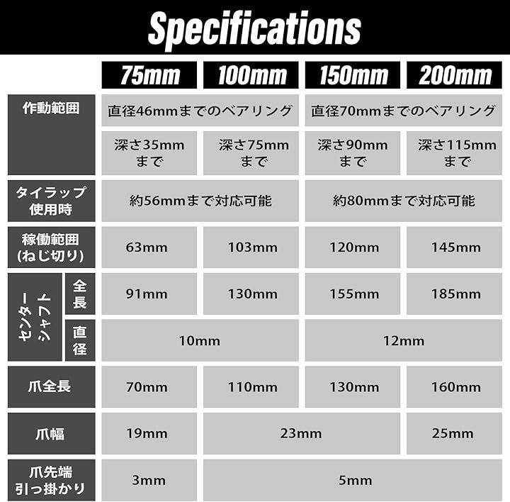 爪の幅や長さ、引っ掛かり寸法もサイズごとに最適化されており、対象物にしっかり掛かる設計です。