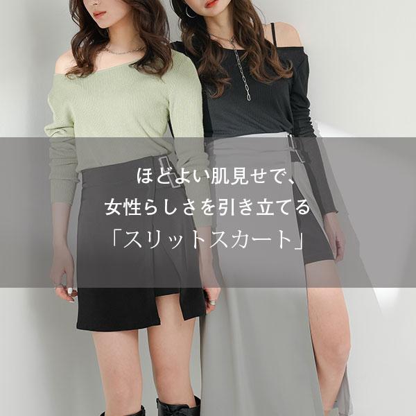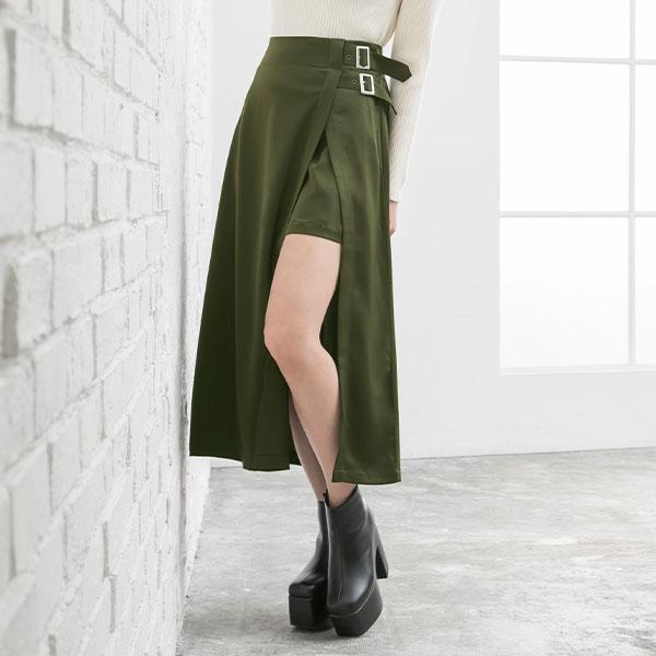 【デザイン】ダブルベルトデザインのレイヤード風スカートです。ミニスカートの上にラップ風デザインを重ねています。サイドスリットから脚をチラ見えできて、色っぽい印象に。後ろウエストがゴムなので着脱も簡単です。スタイリングしやすいワンカラーとコーデの主役になる配色デザインをご用意。
