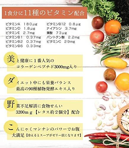 [NEW!]もちもち食感の大豆のお肉がたっぷり!ボリュームUPで満足感抜群の大豆のお肉がチキンのような食感になり、より美味しくなりました。噛みごたえと腹持ちがUPし、間食や夜食に食べても罪悪感ゼロ![ダイエット中の方はもちろん、体に嬉しい成分がたくさん]・美と健康に1番人気のコラーゲンペプチド3000mg入り・ダイエット中にも栄養バランス最高の90種植物発酵エキス入り・野菜不足解消の食物繊維3200mg[レタス約2個分]配合・こんにゃくマンナンのパワーでお腹大満足(冷えるとスープがゼリー状になります)