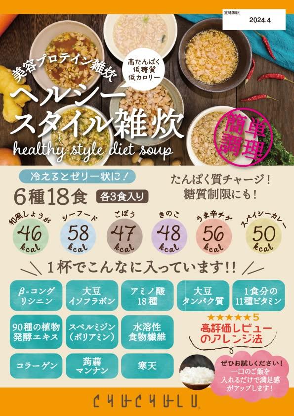 和風生姜:粒状大豆たんぱく、コラーゲンペプチド、難消化性デキストリン、食塩、グラニュー糖、乾燥わかめ、生姜粉末、鰹加工品、粉末醤油、乾燥ねぎ、昆布粉末、カルニチン、カラメル色素、(以下共通)食用植物油脂、こんにゃくマンナン、植物発酵酵素エキス、調味料(アミノ酸等)、ゲル化剤(増粘多糖類)、ビタミン(C、A、D、E、B1、B2、B6、B12)、葉酸、ナイアシン、パントテン酸、(原材料の一部に大豆、、ゼラチン、サバ、小麦、卵、乳を含む)海鮮シーフード:粒状大豆たんぱく、コラーゲンペプチド、難消化性デキストリン、チキンパウダー、ポークパウダー、ホタテパウダー、砂糖、胡椒、ガーリックパウダー、オニオンパウダーうま辛チゲ:粒状大豆たんぱく、味噌、コラーゲンペプチド、難消化性デキストリン、食塩、乾燥キャベツ、ごま、キムチパウダー、グラニュー糖、ガーリック、ポークエキス、唐辛子、粉末醤油、ガーリックパウダー、チキンパウダー、ホワイトッペッパー、レッドペッパージンジャー粉末スパイシーカレー:粒状大豆たんぱく、コラーゲンペプチド、難消化性デキストリン、食塩、グラニュー糖、カレー粉、乾燥ねぎ、ぶどう糖、鰹エキス、胡椒、オニオンパウダー、唐辛子、ガーリックパウダーごぼう:粒状大豆たんぱく、コラーゲンペプチド、難消化性デキストリン、食塩、ごぼう、ごま、乾燥わかめ、グラニュー糖、ガーリックパウダー、オニオンパウダー、粉末醤油、チキンエキス、カレー粉、胡椒きのこ:粒状大豆たんぱく、コラーゲンペプチド、難消化性デキストリン、椎茸、椎茸粉末、食塩、グラニュー糖、鰹加工品、粉末醤油、昆布粉末、カラメル色素内容量:6種類x3袋 計18個カロリー:【和風生姜】46kCal【海鮮シーフード】58kCal【ごぼう】47kCal【スパイシーカレー】48kCal【うまからチゲ】56kCal【きのこ】48kCal商品サイズ(高さx奥行x幅):30cm×15cm×40cm原産国:日本【重要】メーカーによる商品リニューアルに伴いパッケージ(内容量も含む)変更が行われた場合、新パッケージでお届け致します事ご了承願います。