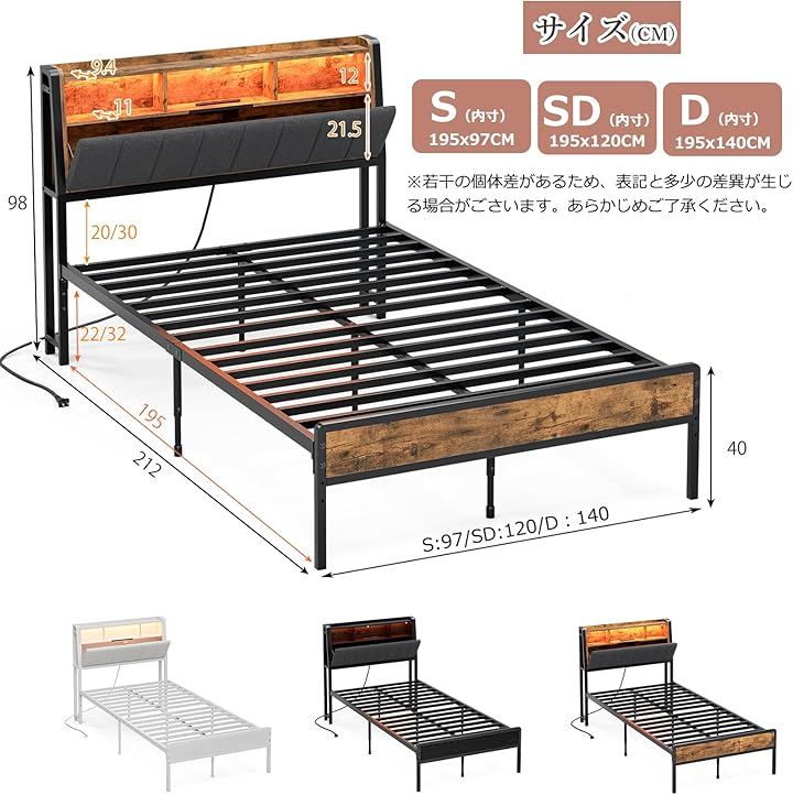 「商品仕様」*商品サイズ(cm):幅97x奥行212x高さ98cm *対応マットレスサイズ:シングルサイズ(幅97x長さ195cm)*商品重量:約25kg *梱包サイズ:106.5x43x16CM *梱包重量:28kg *材質:本体/スチール(粉体塗装)棚板/MDF *耐荷重:本体/約350kg ヘッド部棚/約20kg *カラー:ブラック/ホワイト/ビンテージ 組立品/完成品:組立品(2人で組立て時間約45分)。
