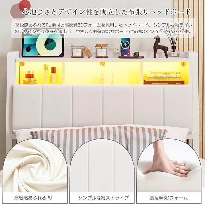 「心地よさとデザイン性を両立した高級感あふれるヘッドボード」高密度で適度な反発力を持つ3Dフォームが、背部をしっかり支えながらも、柔らかく包み込むような座り心地を実現。