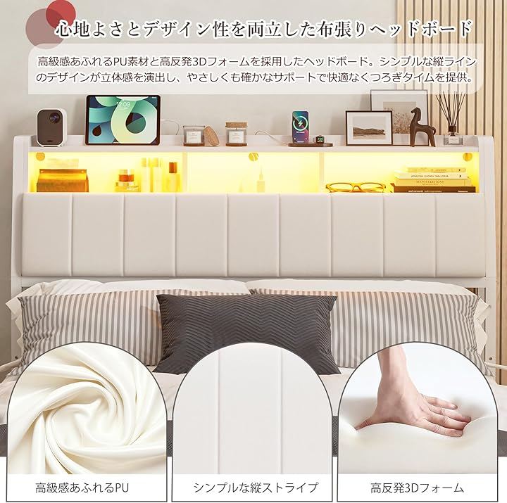 「心地よさとデザイン性を両立した高級感あふれるヘッドボード」高密度で適度な反発力を持つ3Dフォームが、背部をしっかり支えながらも、柔らかく包み込むような座り心地を実現。