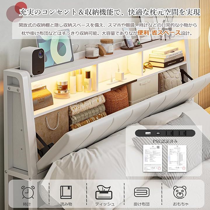 「充実の収納&コンセントで叶える、快適な枕元空間」開放式の収納棚と大容量の隠し収納スペースを備え、スマホや眼鏡、時計などの日常的な小物はすぐ手に取れる場所に。